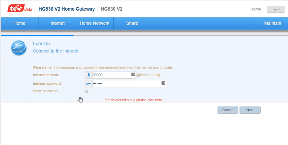 ثم ادخل اليوزر نيم و الباسورد الذى تحصلت عليهم من خدمة العملاء لتفعيل خدمة الانترنت على راوتر السرعات الفائقة الجديد و اضغط على Next .